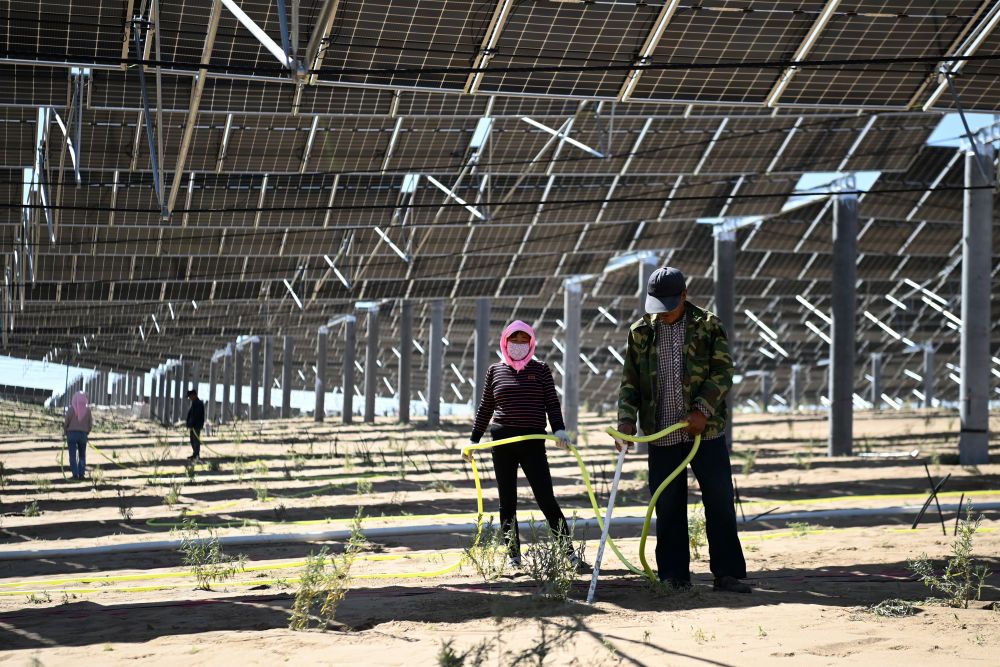 9月29日,在位于甘肃省武威市凉州区的甘肃武威50万千瓦立体光伏治沙产业化示范项目建设现场,工人给光伏板下沙生植物浇水。新华社记者 范培珅 摄