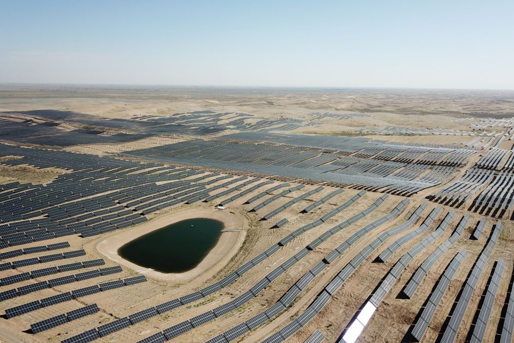 站在高处远望,一排排像鱼鳞一样的光伏板列阵于甘肃省武威市北缘的腾格里沙漠,在阳光的照射下闪闪耀眼。光伏板下,沙生植物正在吐着新绿,与远处的荒沙形成鲜明对比。