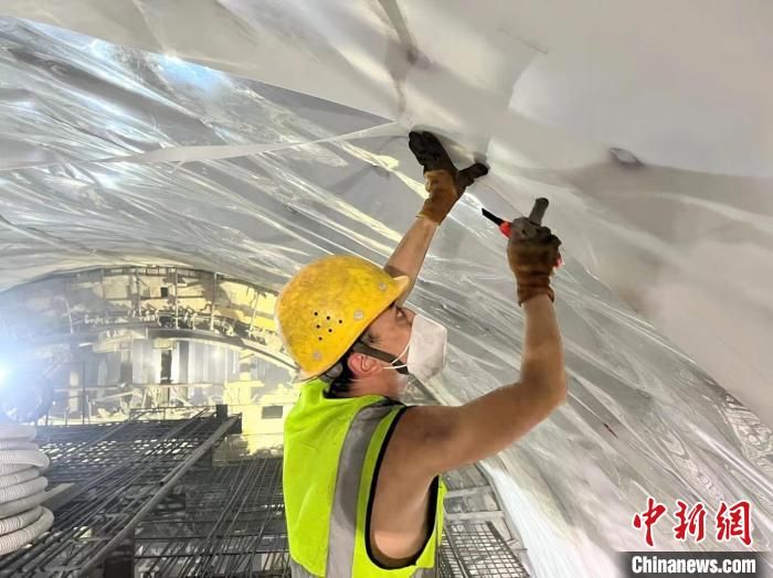 在施工现场,技术员们分别在查看图纸、测量放样、指导施工,工人们在绑扎钢筋、架设模板、焊接切割、浇筑混凝土。装载机、挖掘机、运输车等施工机械在隧道内来回穿梭,机器作业轰鸣声此起彼伏,各个工序环环相扣。