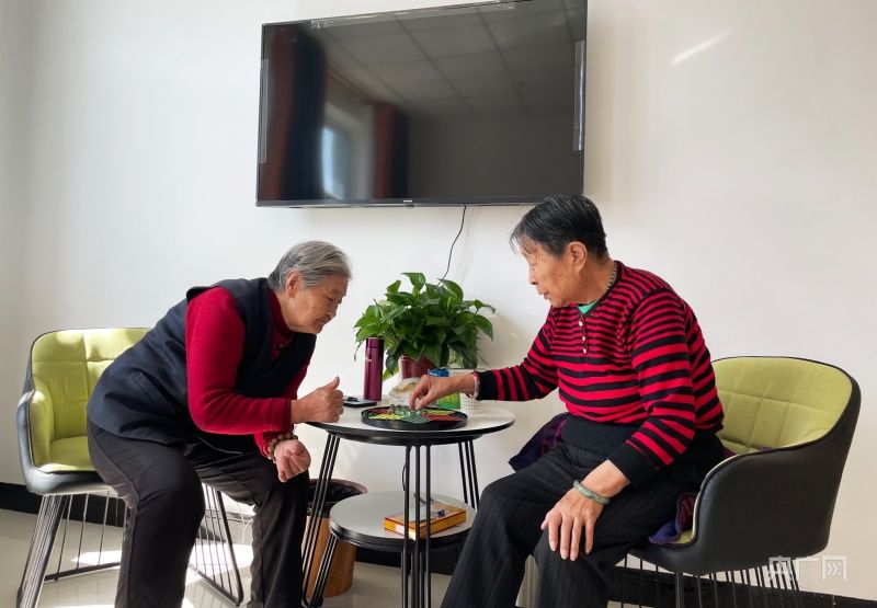 秦玉珍和何秀英在房间内下跳棋(央广网发 白梅薇 摄)