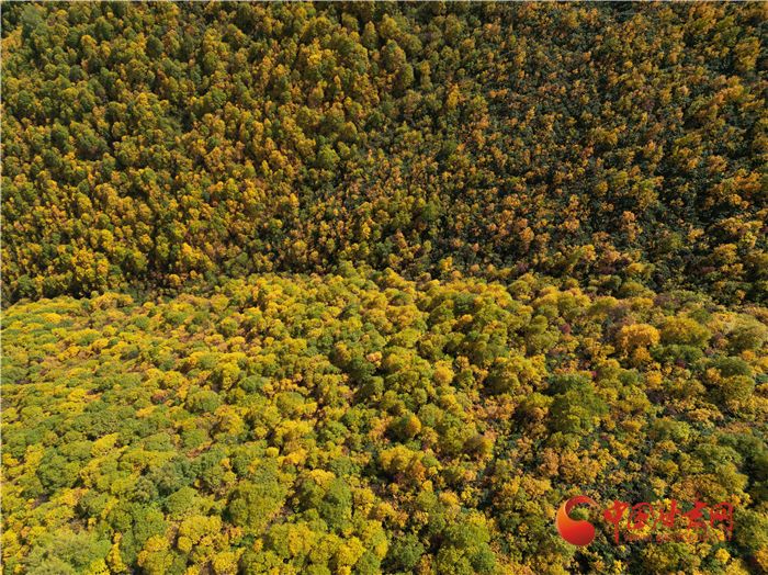 利用航拍机俯瞰山下,山崖染丹色,万树红妆绿裹,在蓝天白云与碧水间,一片多彩绚烂的树林在眼前铺展开来,构成一幅美丽夺目的油画,满目惬意。