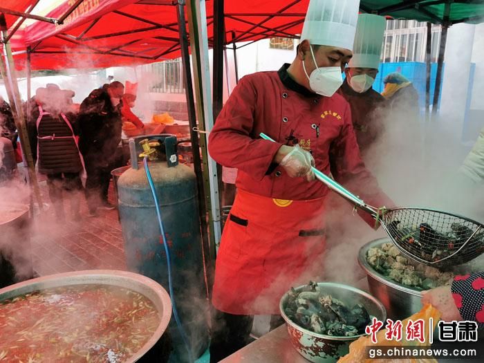 1月14日,北方习俗“小年”这一天,定西市渭源县气温骤降,但元古堆村男女老少齐聚一堂,在村广场一旁支起几口大锅,烹饪各种当地美食小吃,桌上热气腾腾的烩菜和金黄酥香的炸油饼,台上轮番上演的歌舞节目,以及忙前忙后的村民志愿者服务队……节日气氛格外浓厚。