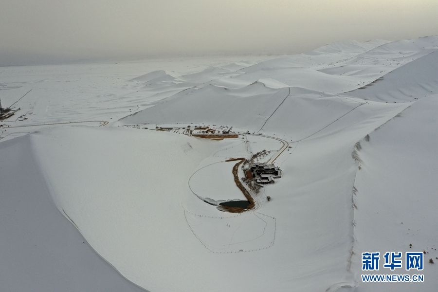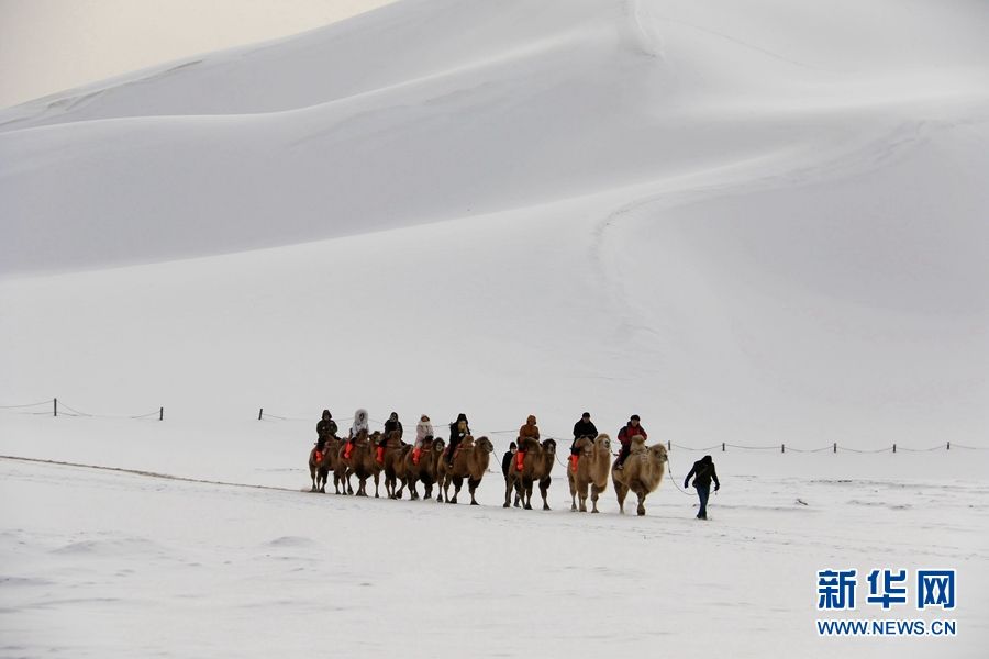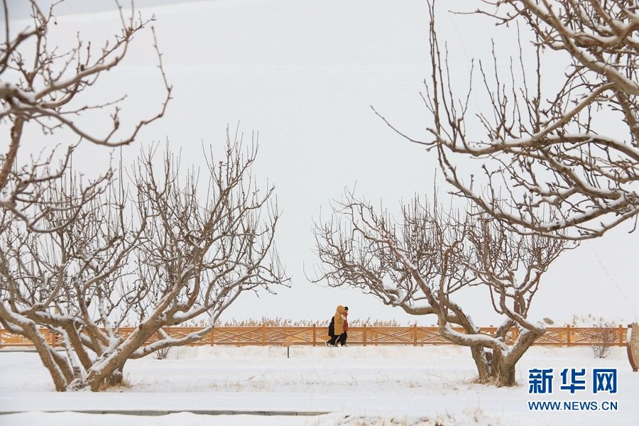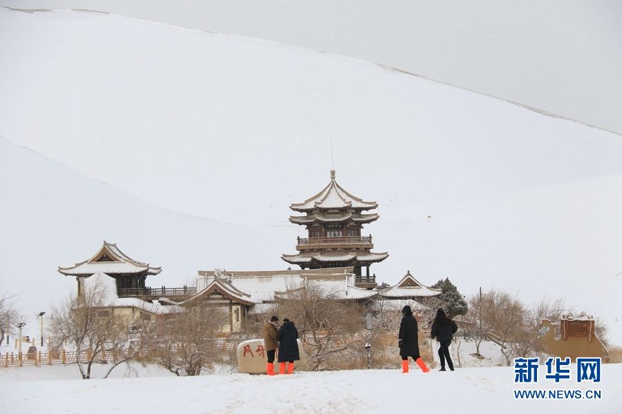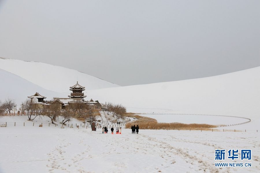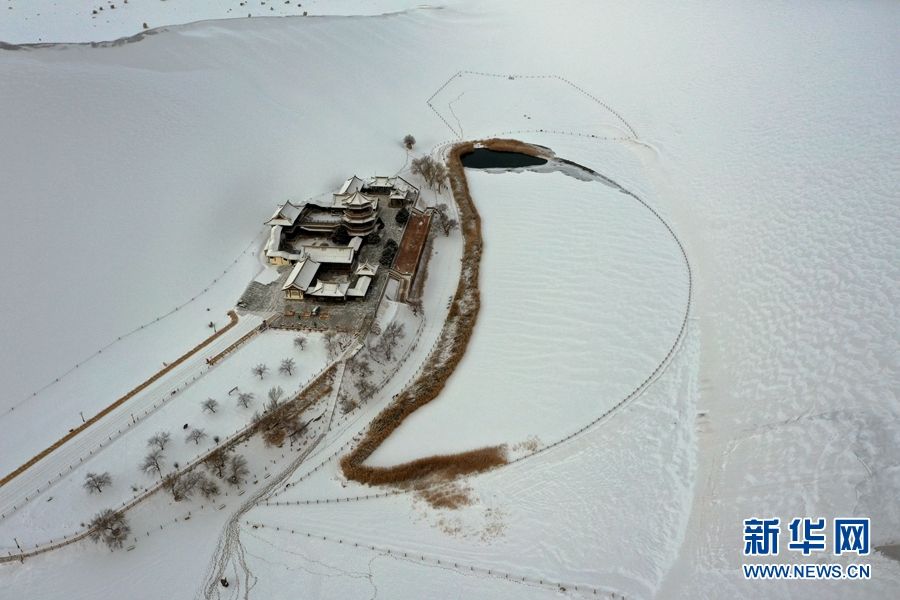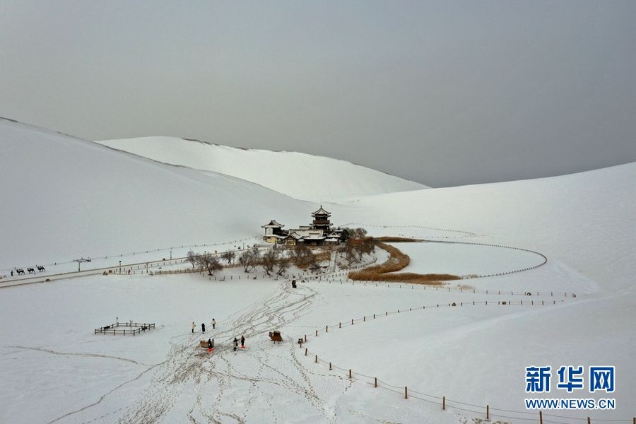 受高空槽东移影响,1月12日甘肃省敦煌市迎来2023年首场降雪。雪后的鸣沙山月牙泉景区银装素裹,景色如画,美不胜收。