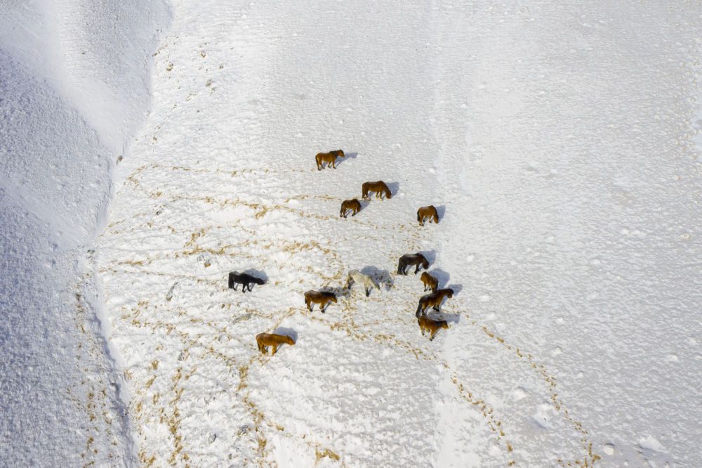 ↑1月14日,马群在祁连山区活动(无人机照片)。