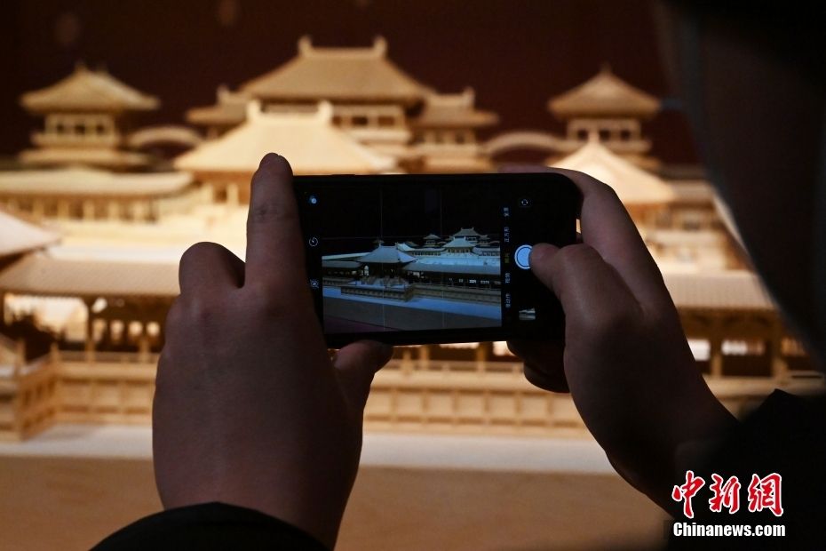 游客正在拍摄“千年营造——敦煌壁画中的建筑之美”特展上的佛寺建筑群模型。