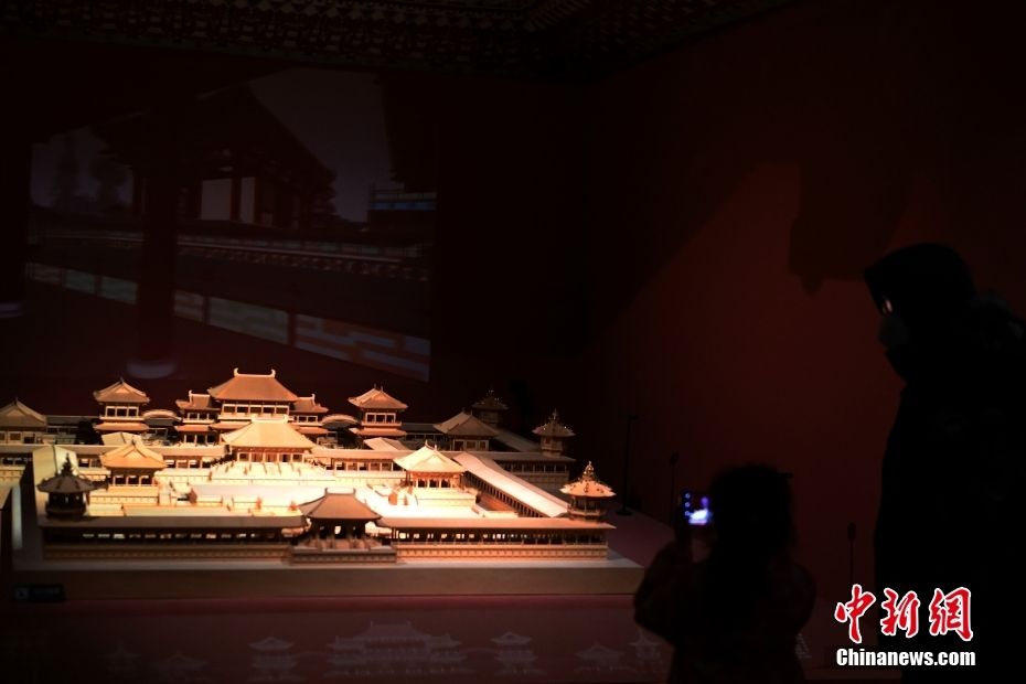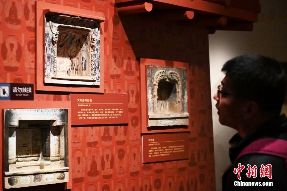 游客正在参观“千年营造——敦煌壁画中的建筑之美”特展上出自莫高窟第419窟的火焰券方形龛模型。(中新社记者 李亚龙 摄)