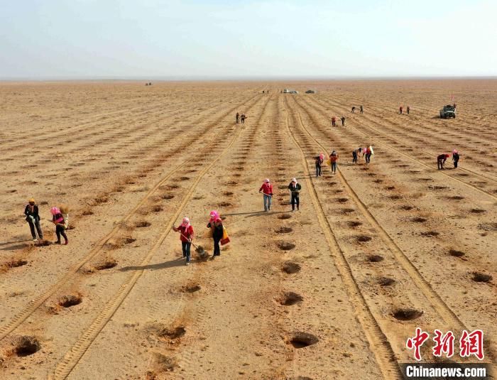 图为甘肃省武威市民勤县播绿队伍,在戈壁沙海植绿。(资料图)马爱彬 摄
