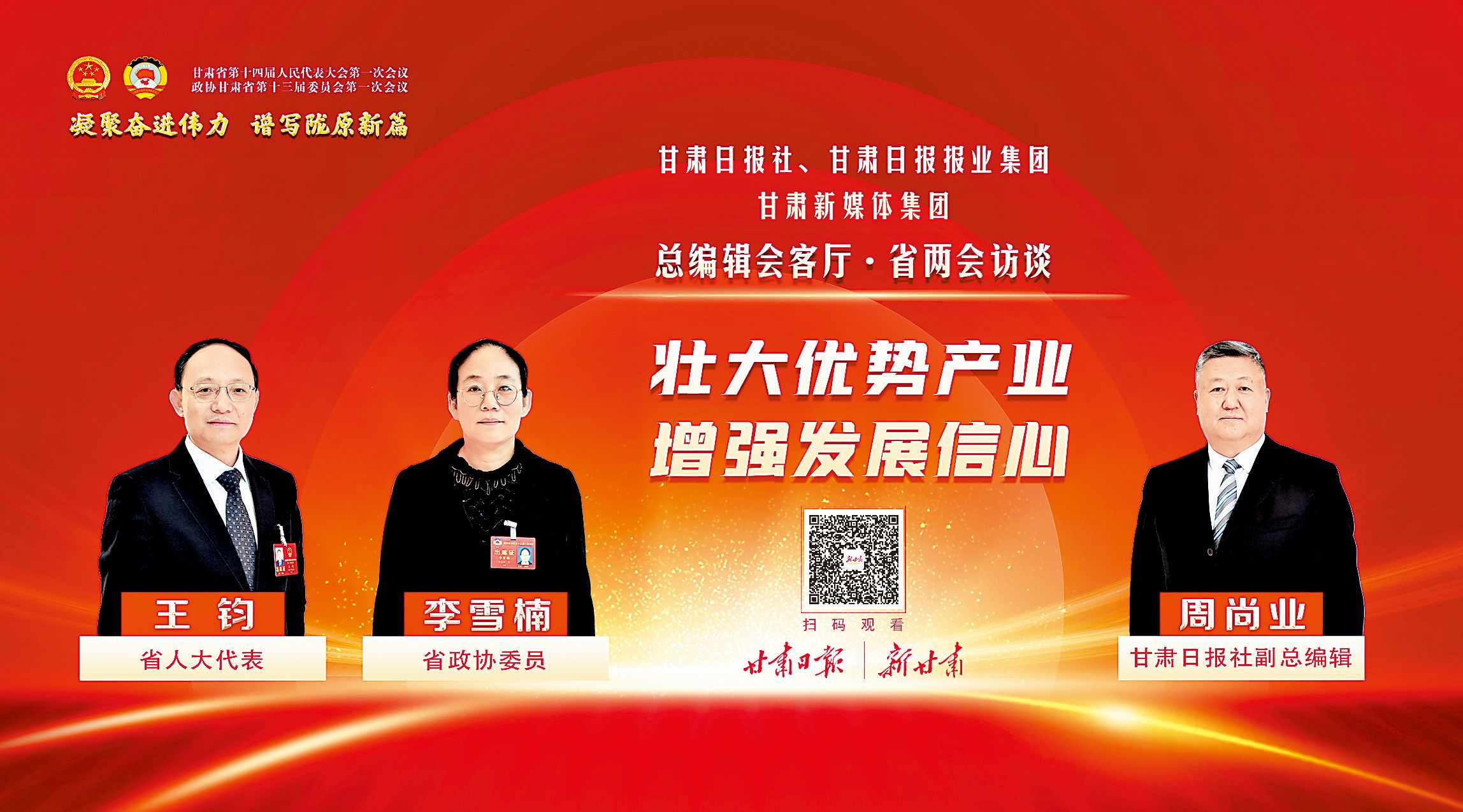 1月17日,省人大代表、金昌市委书记王钧,省政协委员、省市场监管局副局长李雪楠两位嘉宾走进本报两会“总编辑会客厅”,与甘肃日报社副总编辑周尚业就加快构建现代化产业体系、打造良好的消费环境等话题展开对话。