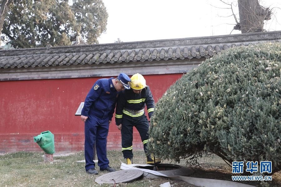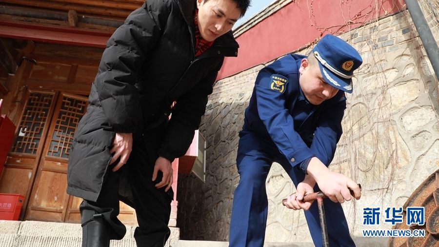 杨天祥在玉泉观景区同工作人员检查地下消防栓运行情况。(1月18日摄)