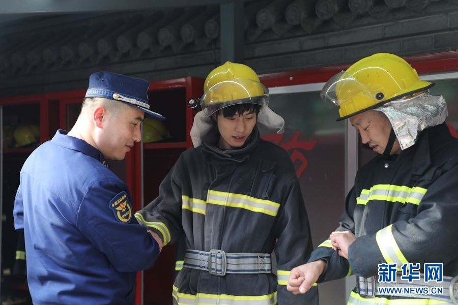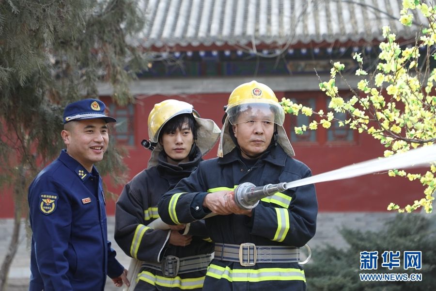 杨天祥在伏羲庙景区指导景区保安正确穿戴消防灭火服。(1月18日摄)