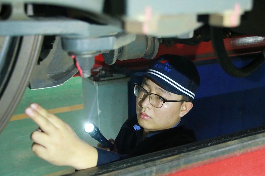 夜晚,银川动车所动车检修库内,灯火通明,在距离地面1.6米的狭长地沟内,不时传出叮叮当当的敲击声。25岁的动车组机械师陈旭刚正在全神贯注检查着动车组,只见他抬头、弯腰、下蹲,“花式”穿梭在动车底部各部件间。