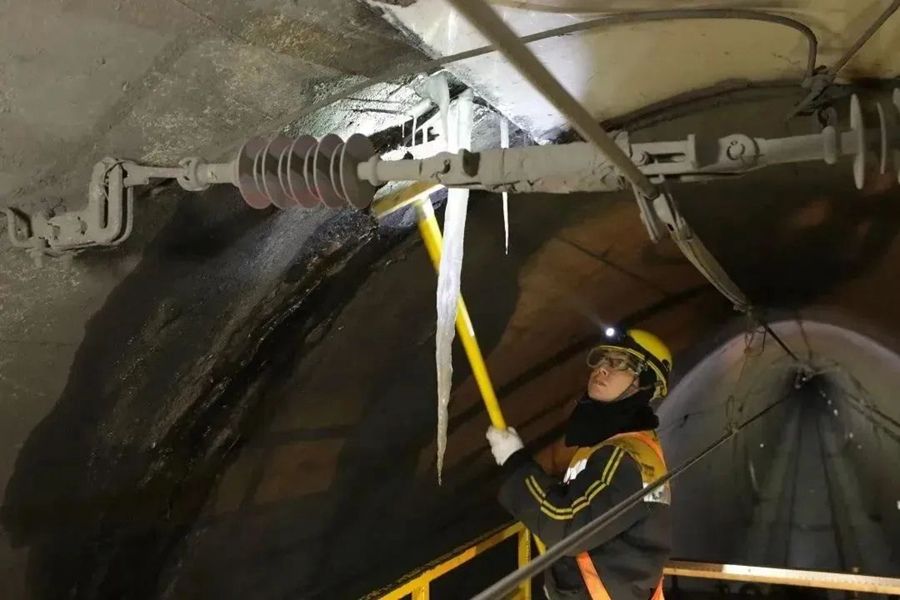 “每年冬季严寒时段,隧道拱顶壁上就会‘长’出冰柱,这些冰柱如不及时处理,隧道顶结冰将使铁路供电系统跳闸,严重危及行车安全。”隧道里寒气逼人,作业车缓慢前行,王大友站在高高的作业平台上搜寻结冰点,“前方有冰柱,准备打冰。”说着王大友和工友们拿起五米多长的绝缘杆进行“精准打击”,打冰杆有十多斤,挥动起来十分费力,操作人员不仅要把握挥舞力度,还要随时注意掉下来的冰块,碎冰渣如雨点般掉落,随后他们熟练地擦拭绝缘子,紧固螺栓,检查完后他们继续前行。