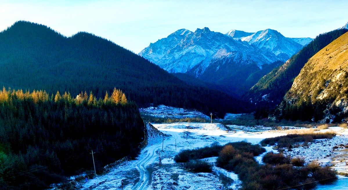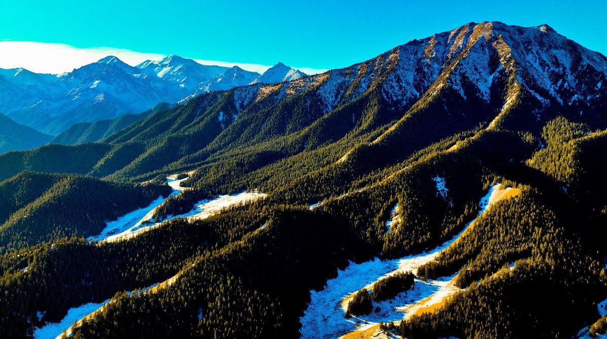 降雪过后,祁连山国家公园甘肃省张掖段肃南片区,远处的巍峨祁连山脉被皑皑白雪层层包裹,苍松翠柏,矗立其间,雪后草原,分外妖娆,一派山舞银蛇的壮美北国风光。