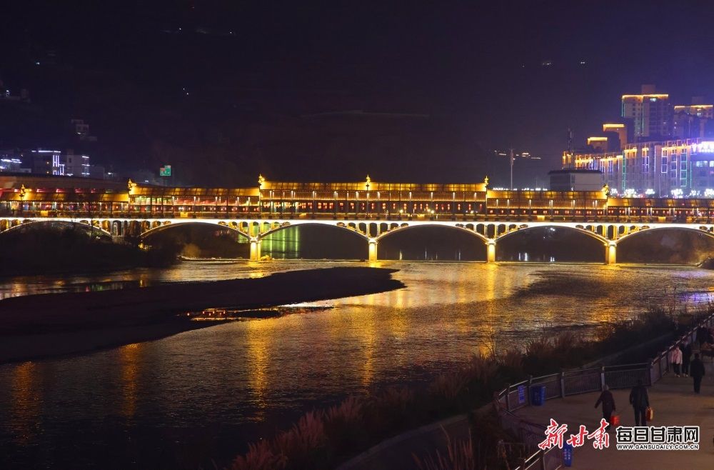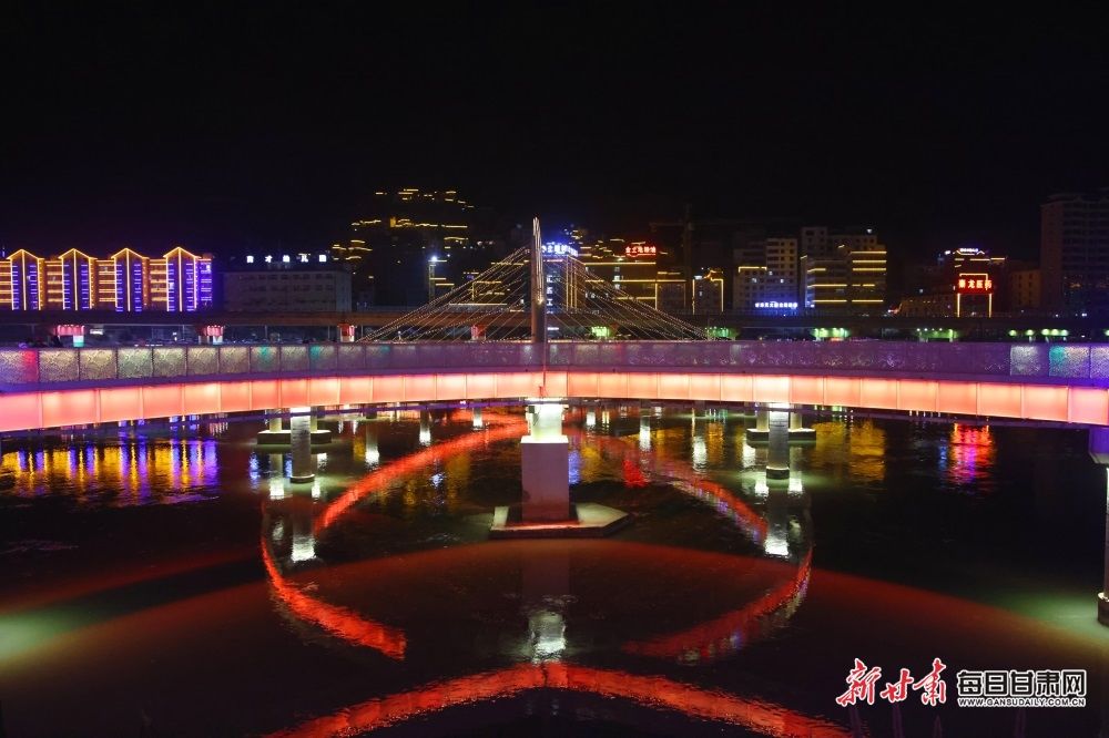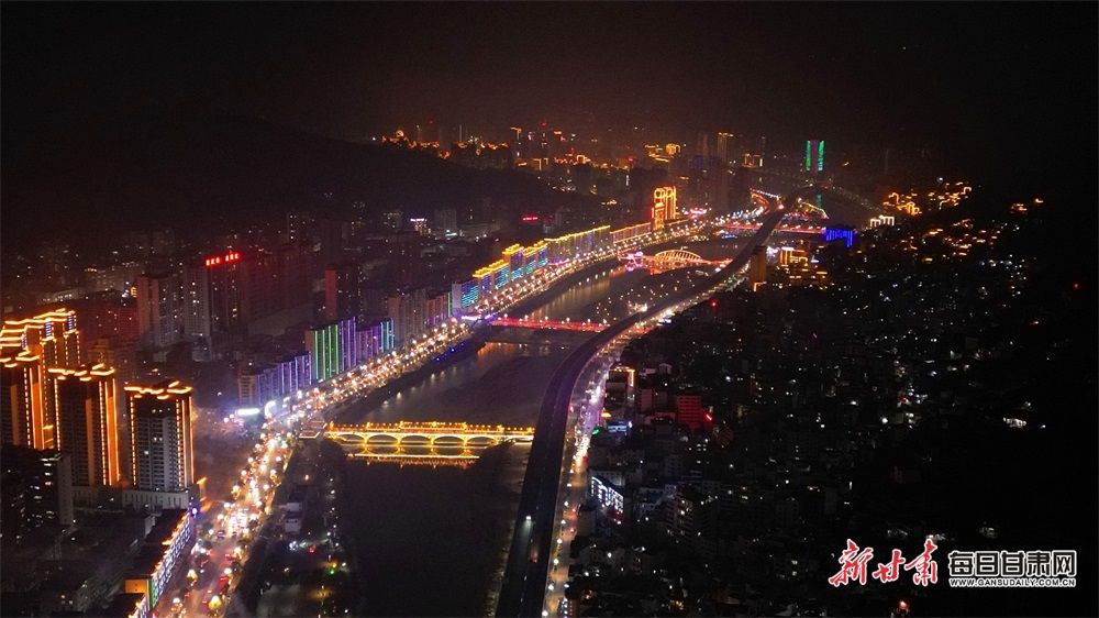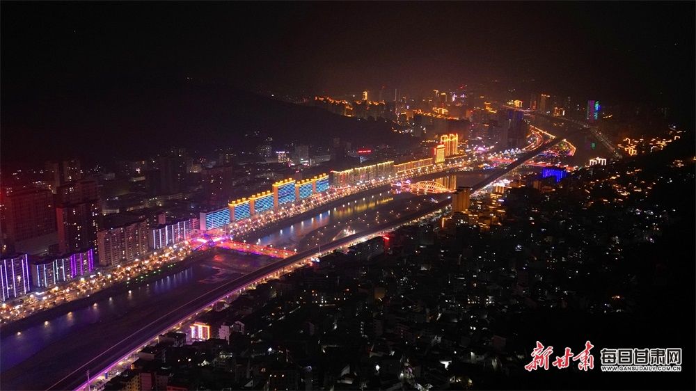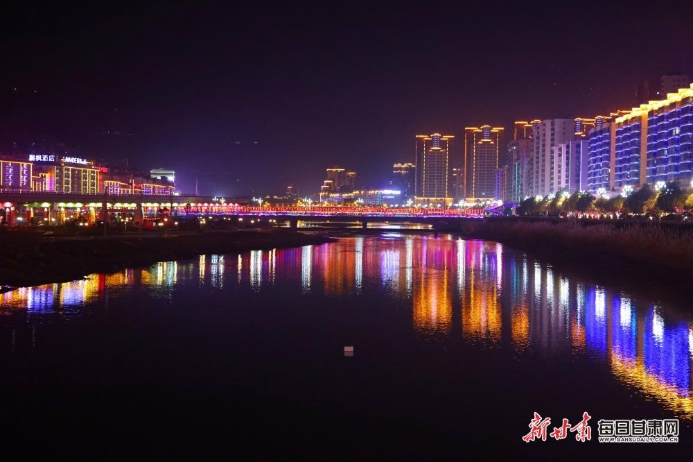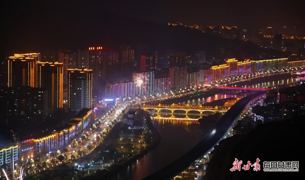 春节期间,当华灯初上时,陇南市武都区白龙江畔,绚丽灯光勾勒出流光溢彩的城市夜色,营造出浓浓节日氛围。