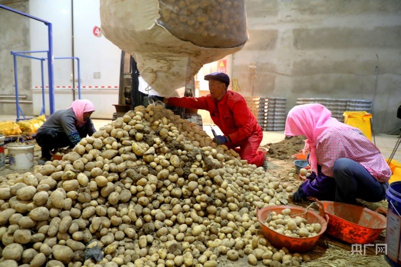 工作人员正在初选恒温冷藏的马铃薯(央广网发 王晓泾 摄)