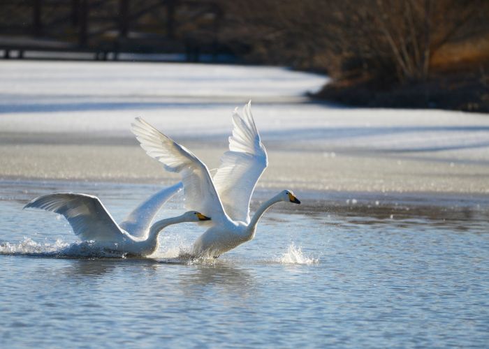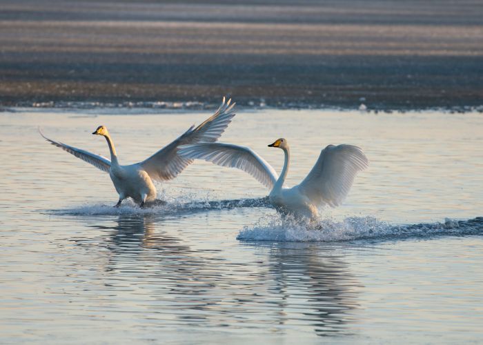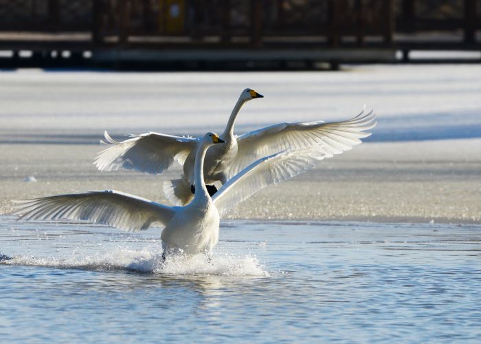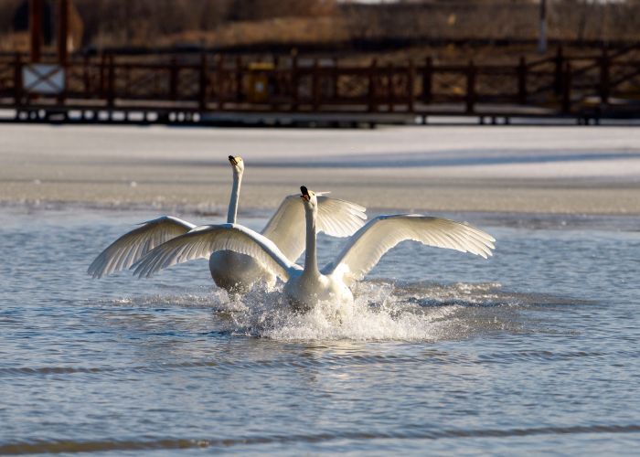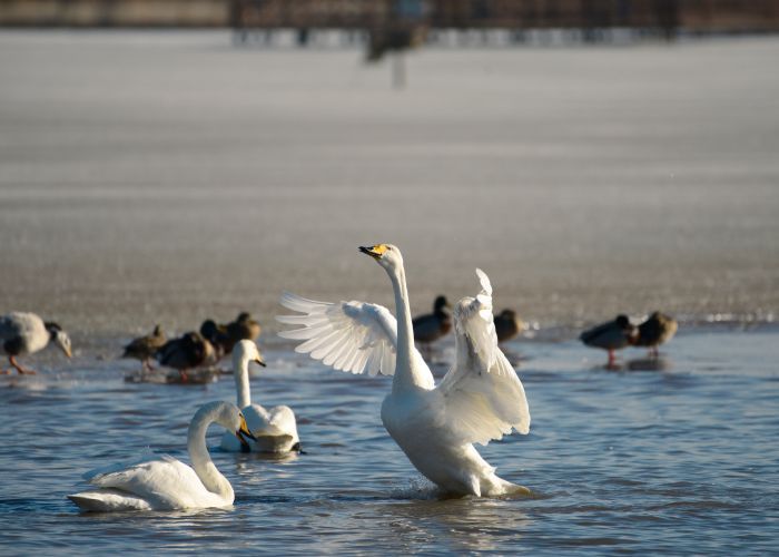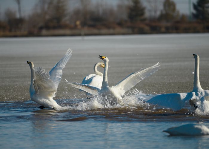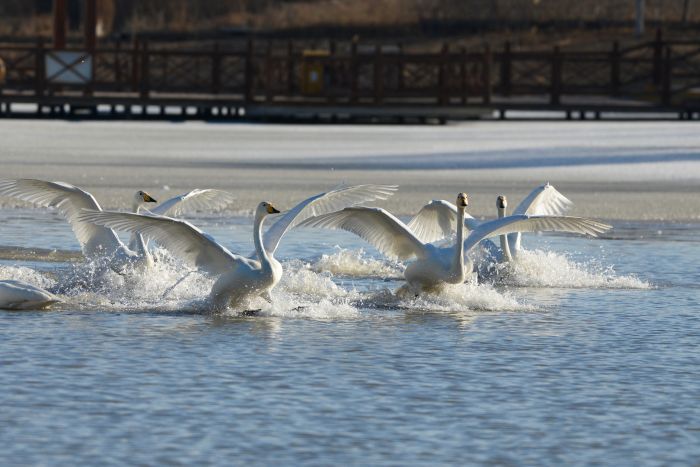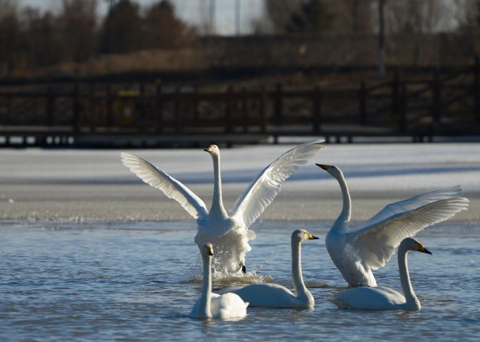 2月26日,张掖国家湿地公园天鹅湖,二十多只野生白天鹅悠闲地嬉戏、觅食、起舞,呈现出一幅自然和谐的生态画卷。