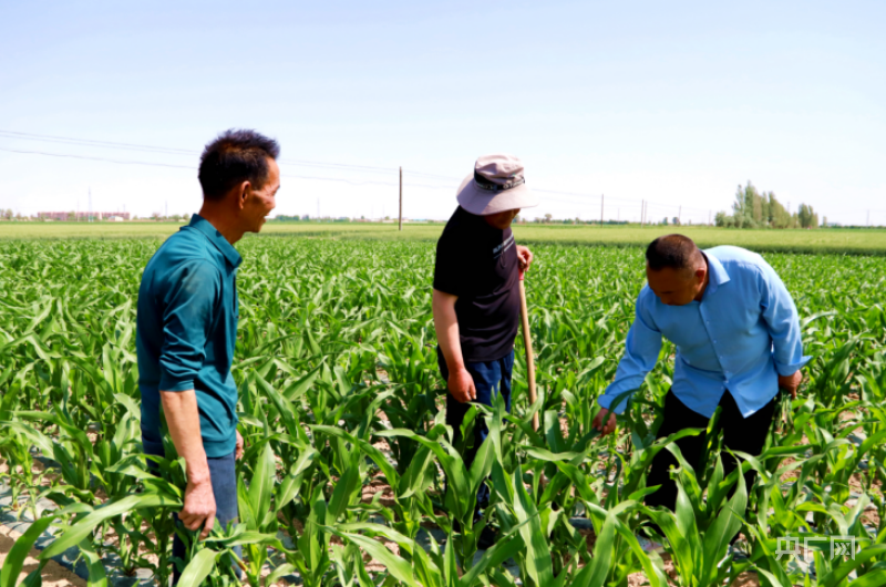 农技人员查看玉米长势情况(央广网发 薛慧 摄)