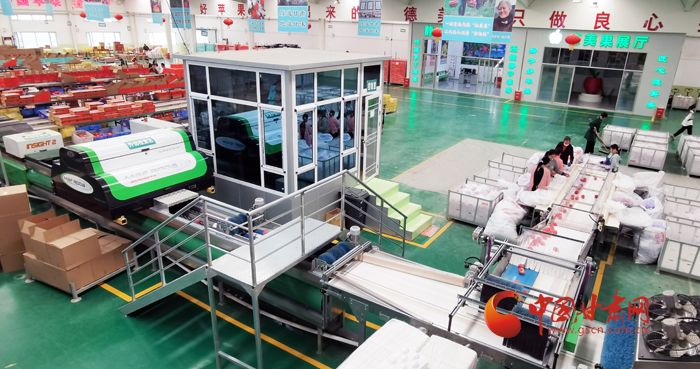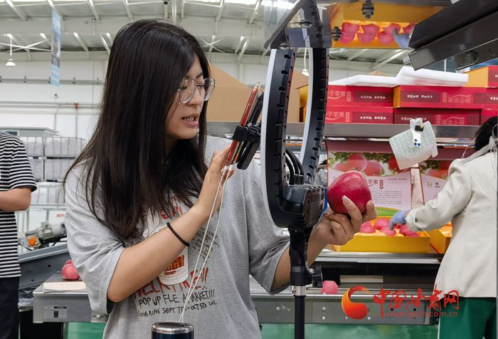 “我们‘德美果’口感爽脆,酸甜适度,耐储存,颜色鲜艳,平凉静宁原产地直接供应,早上十点前下单,当天可发货……”车间内,甘肃德美地缘现代农业集团有限公司电子商务直播部工作人员李艳丰正在直播推介。