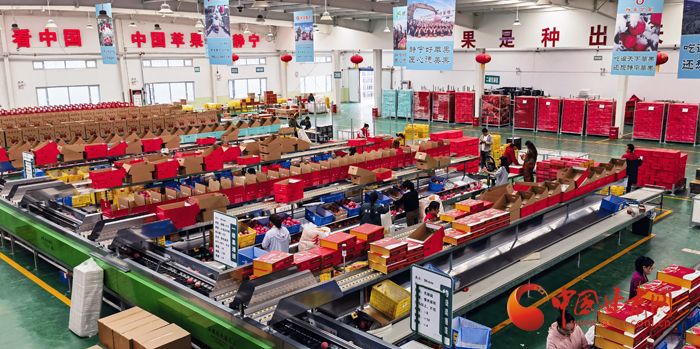 走进分选车间,现场一派繁忙景象,工作人员正在对每颗苹果进行二次筛选,从外在形象和内在品质保证苹果质量。