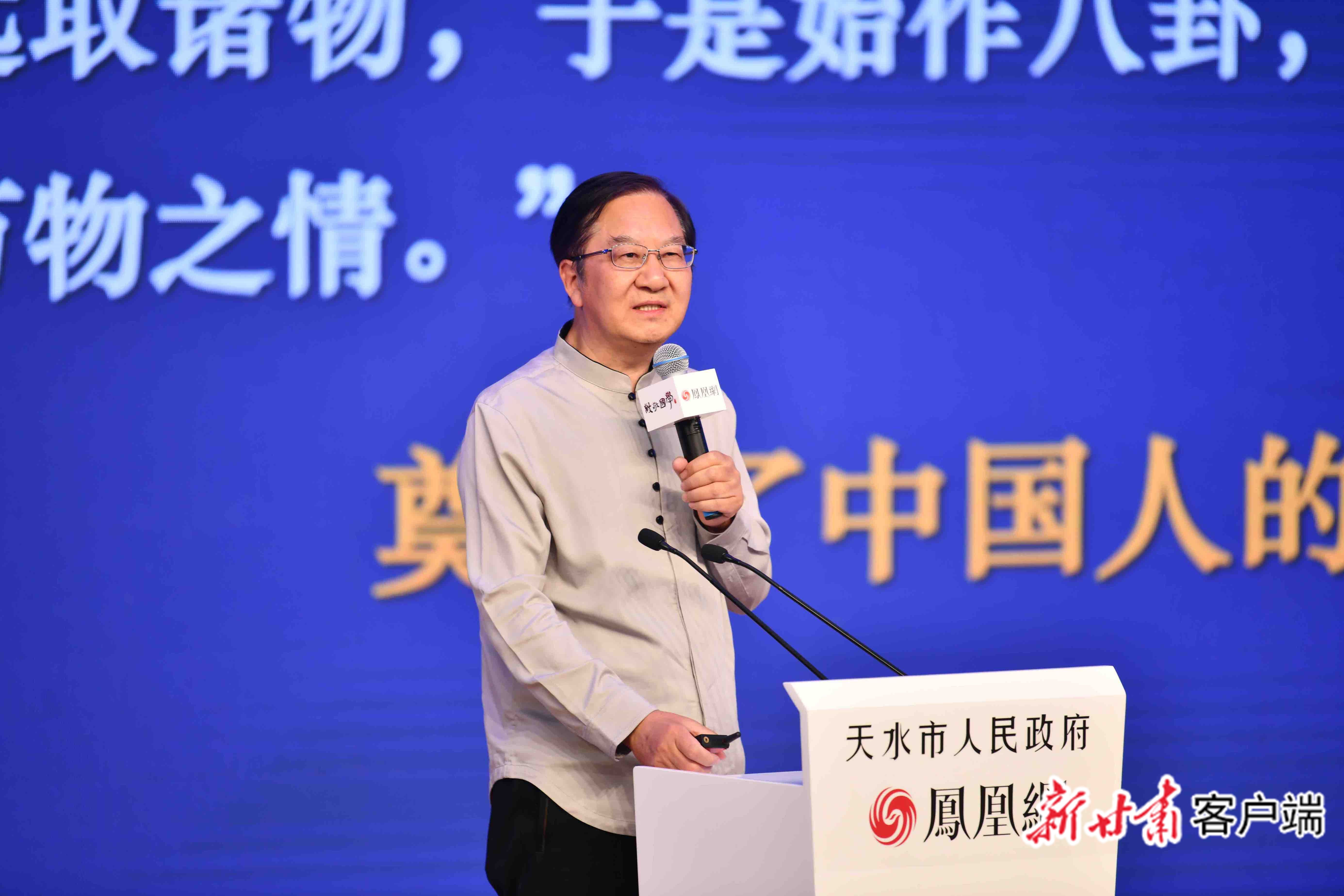 主旨演讲一开始,张其成率先向现场嘉宾抛出提问:“大家猜猜这是我第几次来天水了?”停顿3秒后,他笑着用手比划出“八”的手势,“这是我第8次来天水了。每一次到来都是一次对伏羲文化的追根溯源。”