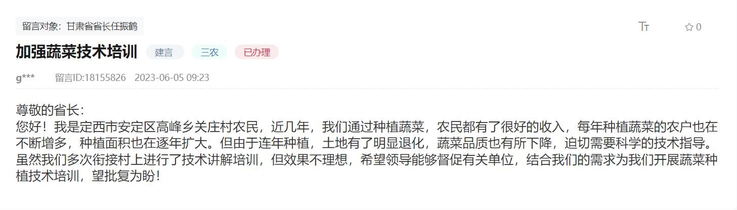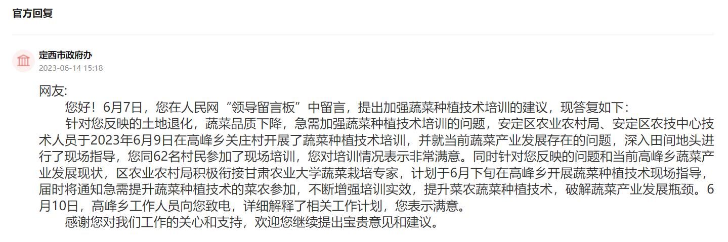 收到网友留言后,定西市政府办及时回复网友留言:“针对您反映的急需加强蔬菜种植技术培训的问题,安定区农业农村局、安定区农技中心技术人员于2023年6月9日在高峰乡关庄村开展了蔬菜种植技术培训,并就当前蔬菜产业发展存在的问题,深入田间地头进行了现场指导,您同62名村民参加了现场培训,您对培训情况表示非常满意。同时针对您反映的问题和当前高峰乡蔬菜产业发展现状,区农业农村局积极衔接甘肃农业大学蔬菜栽培专家,计划于6月下旬在高峰乡开展蔬菜种植技术现场指导,届时将通知急需提升蔬菜种植技术的菜农参加,不断增强培训实效,提升菜农蔬菜种植技术,破解蔬菜产业发展瓶颈。”