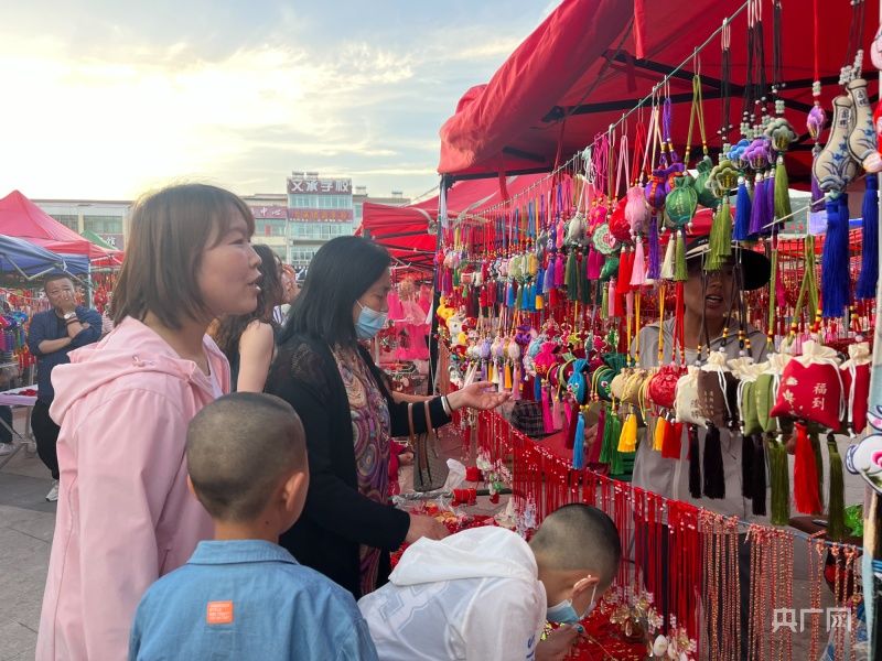 在端午节即将来临之际,甘肃省平凉市庄浪县文化广场里的摊位依次排开,荷包香囊、香粽甜醅、文玩挂件……穿行其中的市民看物问价,十分热闹。
