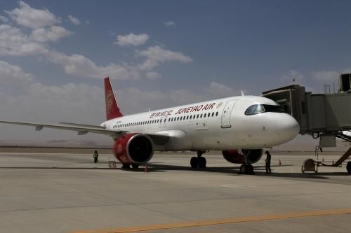 3、2023年6月22日,吉祥航空上海至敦煌直飞首航航班停靠在甘肃敦煌莫高国际机场。
