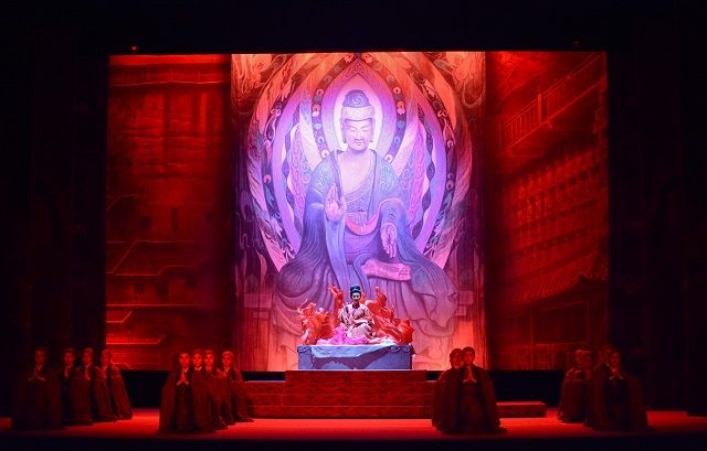 “千载遗石窟,百代事浮图”,在名满天下的麦积山石窟第44号石窟中,有一尊被誉为“东方维纳斯”的坐佛雕像,她那超然的微笑弥漫着春晖般温暖,悲悯的胸怀净化着前来拜谒人们的心灵。6月21日晚,由天水西秦腔艺术剧院联袂甘肃省秦腔艺术剧院、甘肃省陇剧院全新复排演出的大型秦腔历史剧《麦积圣歌》,用一曲凄婉壮美的历史长歌,深度还原这尊雕塑背后的历史故事,为参加2023(癸卯)年公祭中华人文始祖伏羲大典的海内外宾客和天水市社会各界群众献上了一道丰厚的艺术盛宴。