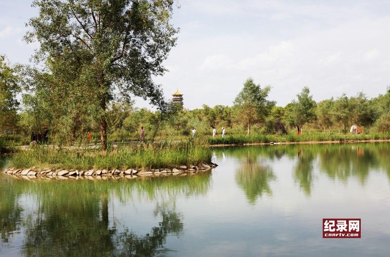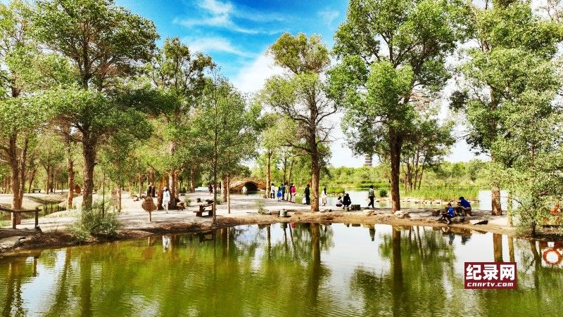 6月23日,金塔沙漠胡杨林景区的万亩胡杨林郁郁葱葱,清澈的湖水、绿意葱茏的胡杨、秀美的水中倒影共同绘成一幅亮丽、绝美的图画,令人陶醉。