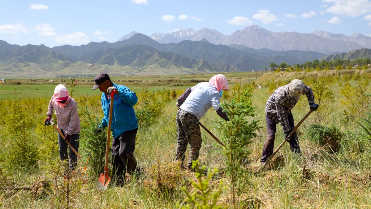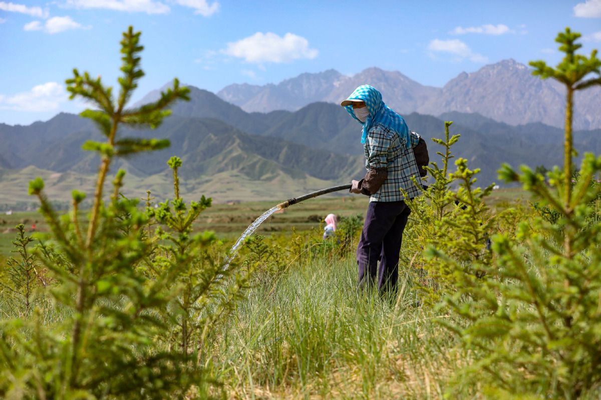 近日,在甘肃省张掖市民乐县丰乐镇国储林项目建设现场,工人们正在紧张有序地进行灌水作业,并对未成活的苗木进行补植补栽。