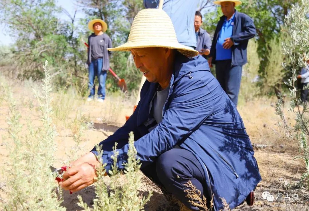 八步沙林场第二代治沙人石银山正在修剪苗木