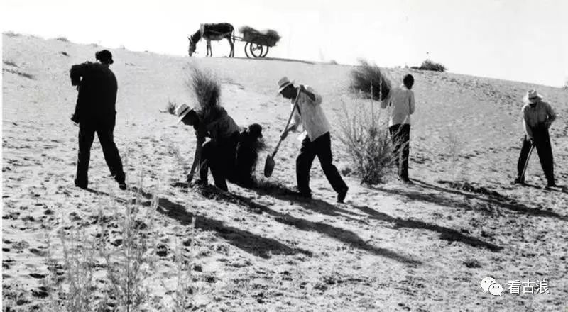 《全国林草系统的一面旗帜——记古浪县八步沙林场场长、“林业英雄”郭万刚》中当年“六老汉”在八步沙植树的场景