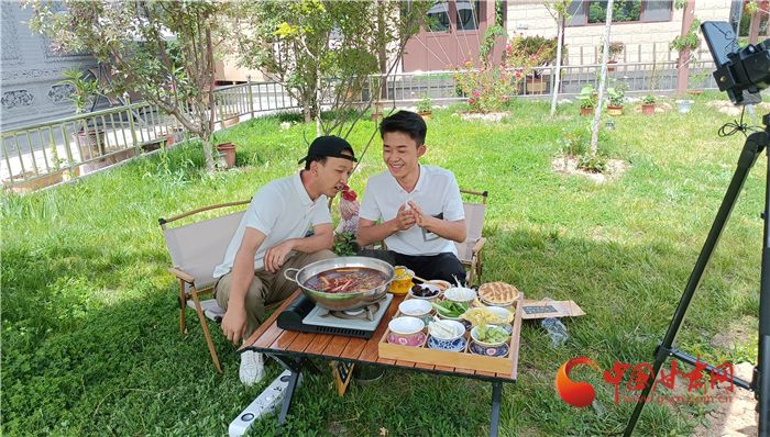 当日上午,折桥村王海云家的农家乐草坪上,一桌美味的火锅带来阵阵香味,来自当地的两名网红边吃边聊,将农家乐的惬意尽收镜头中。