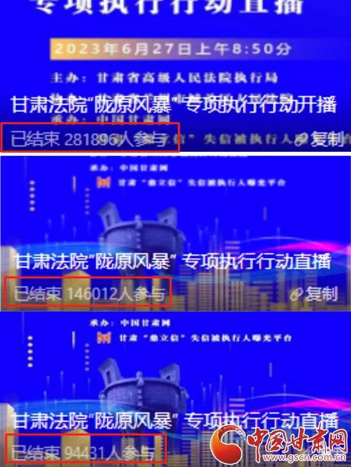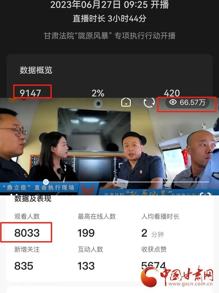 6月27日上午,甘肃法院“陇原风暴”专项执行行动首场直播告捷,累计吸引118万网友“沉浸式”围观,追回拖欠款项金额78910元人民币。