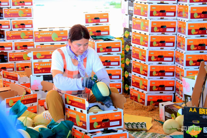 工人正在将蜜瓜套袋装箱(央广网发 韩亚琼 摄)