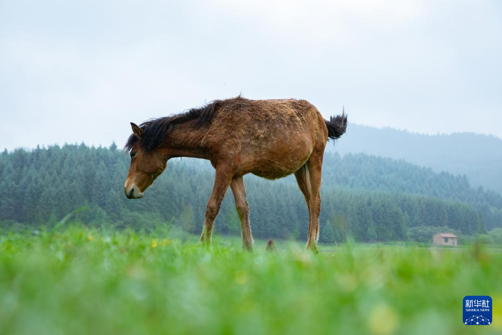 7月1日,小马驹在狼渡滩草原上吃草。新华社记者 郎兵兵 摄