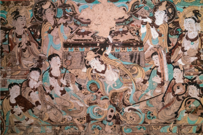 敦煌石窟壁画全面展现了我国古代宗教美术的发展脉络,不仅具有极高的艺术价值,而且具有很高的历史价值,是世界艺术宝库中的一颗明珠。图为敦煌莫高窟中的盛唐壁画 视觉中国/供图