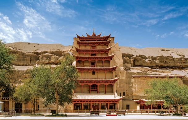 敦煌莫高窟是敦煌石窟艺术的代表。它位于今敦煌市东南25公里处,始凿于前秦建元二年(366)。敦煌石窟艺术是中国传统文化在外来佛教艺术刺激下产生的一种艺术形态,是石窟建筑、彩塑和壁画相结合的佛教文化遗存。中国石窟寺很多,其中保存规模最大、最完整的就是敦煌莫高窟,它不仅对研究中国美术史具有重要价值,还为研究音乐舞蹈史及古代生产生活、衣食住行各个方面提供了珍贵的图像资料。