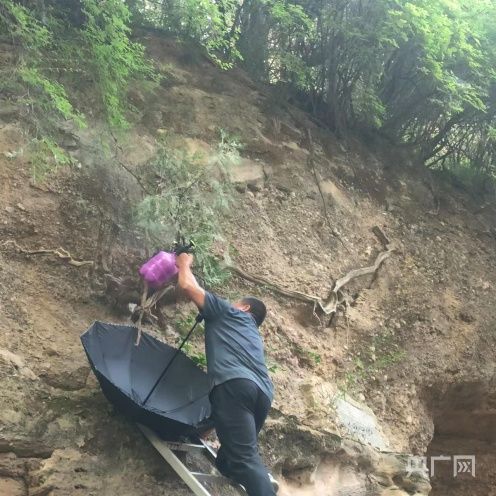 工作人员给悬崖上的古柏喷施防病药剂(央广网发 张文霞 摄)