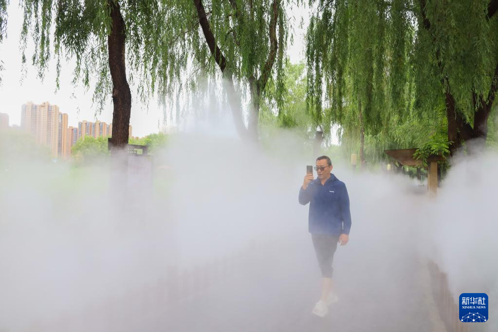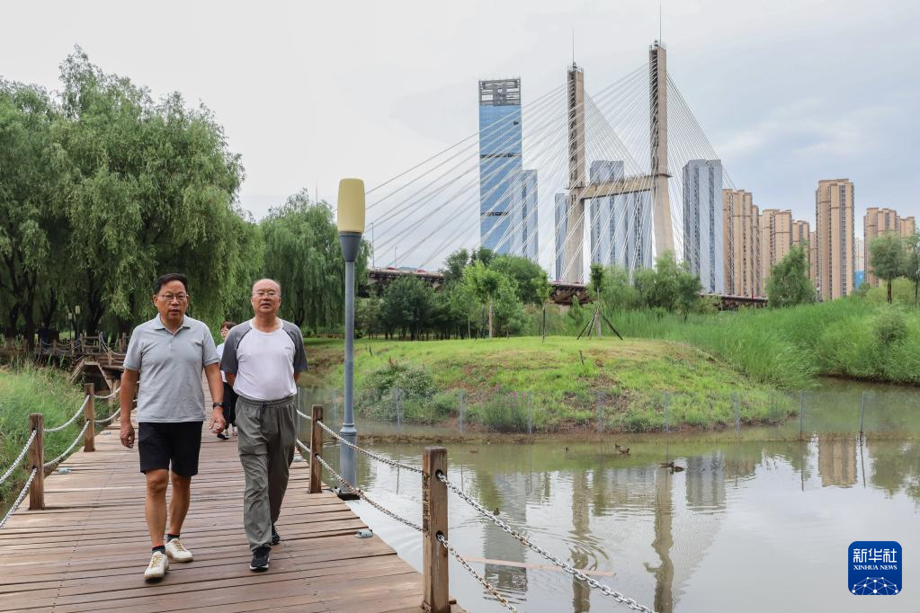 7月3日,在甘肃省兰州市安宁区,市民在银滩湿地公园散步。新华社记者 马希平 摄