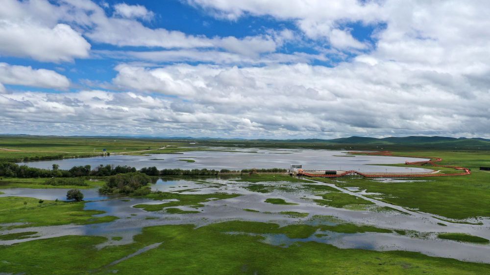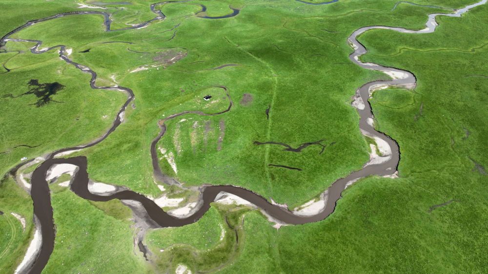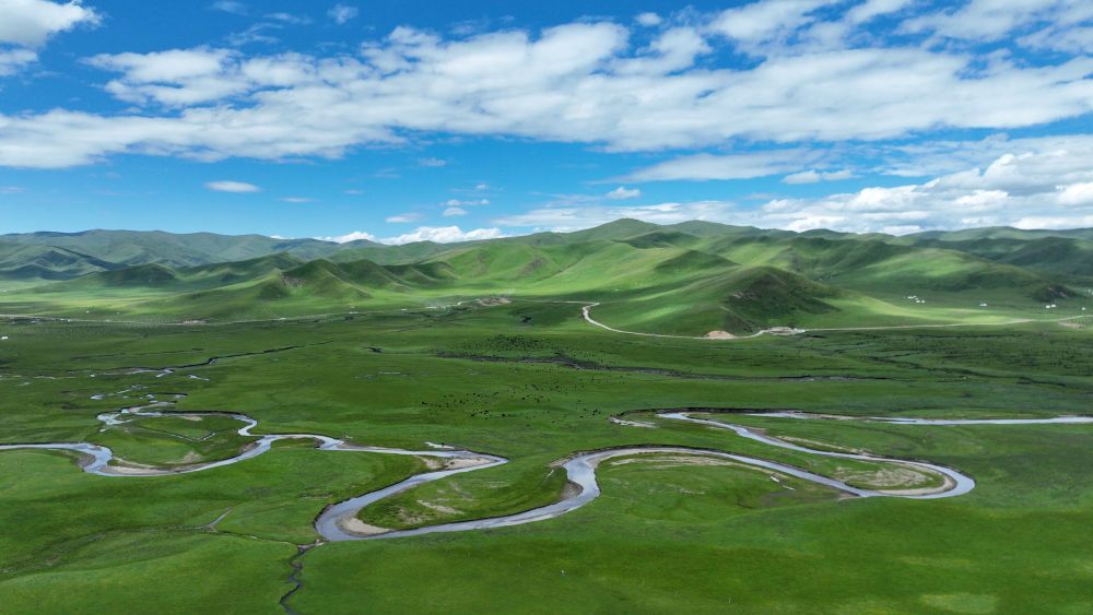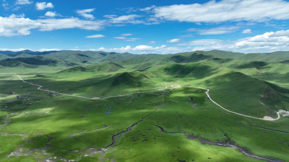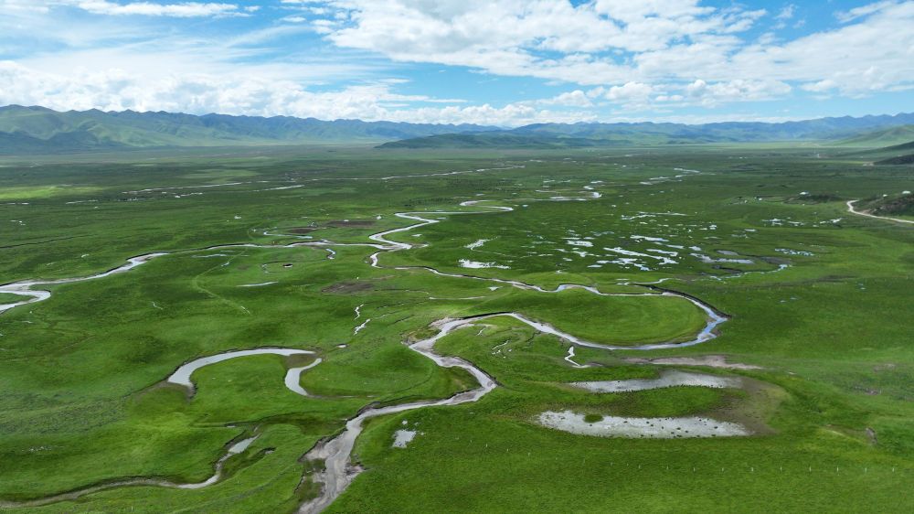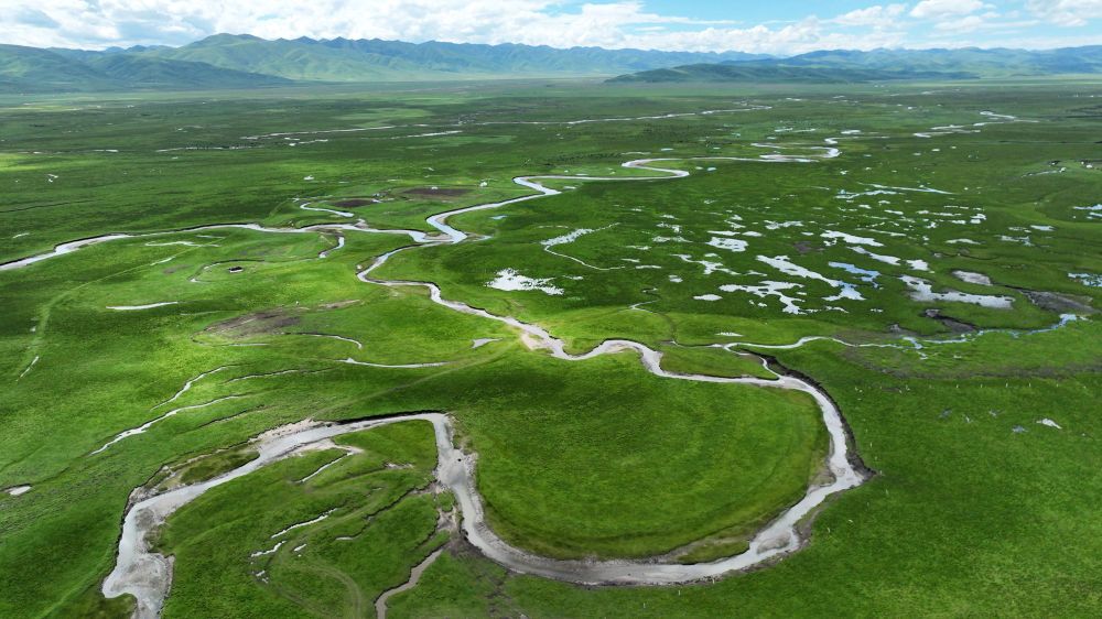 ↑这是玛曲县河曲马场的湿地草原景色(7月5日摄,无人机照片)。