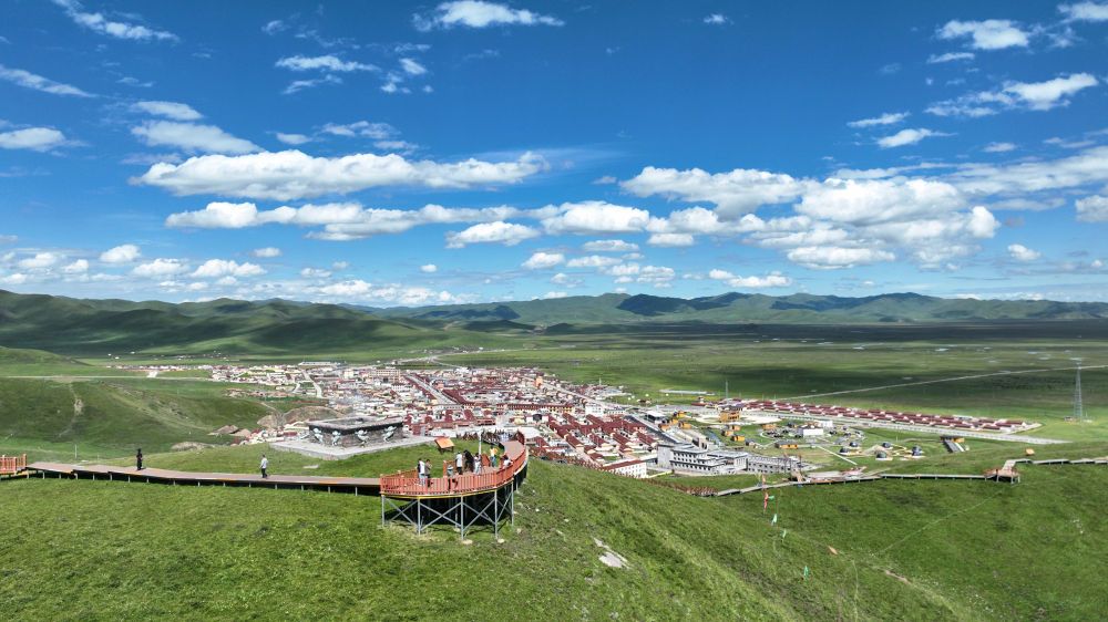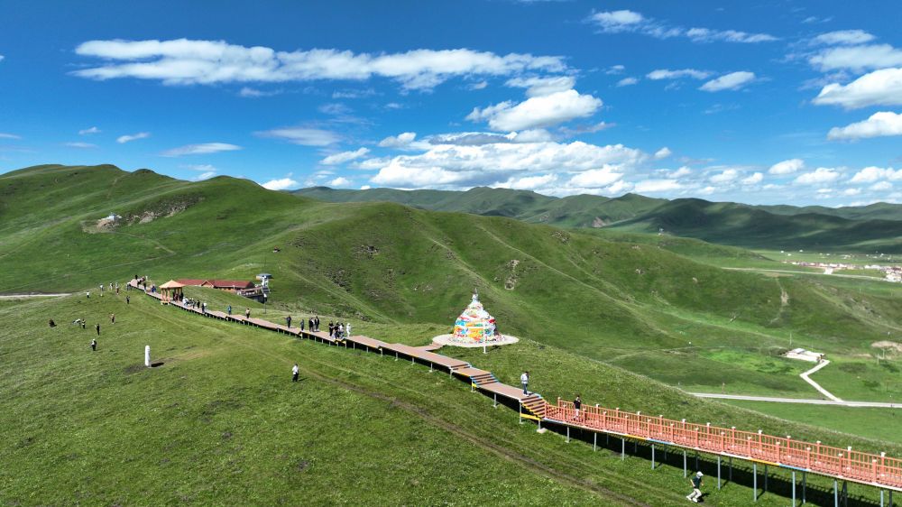 ↑游客在甘南藏族自治州玛曲县阿万仓湿地的观景步道上游览(7月6日摄,无人机照片)。