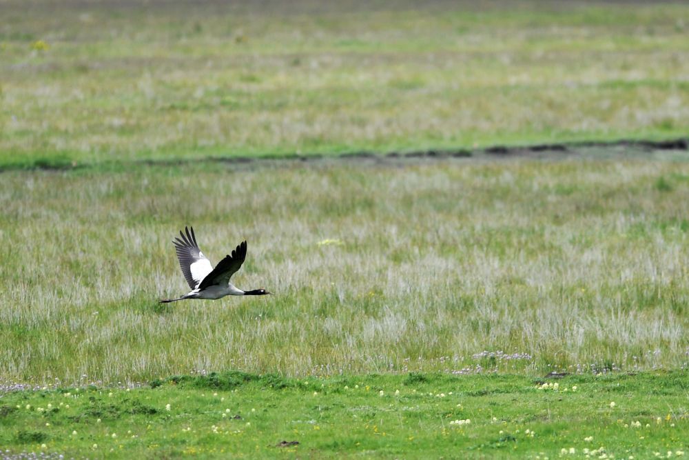 一只黑颈鹤在玛曲的湿地草原上飞翔(7月6日摄)。