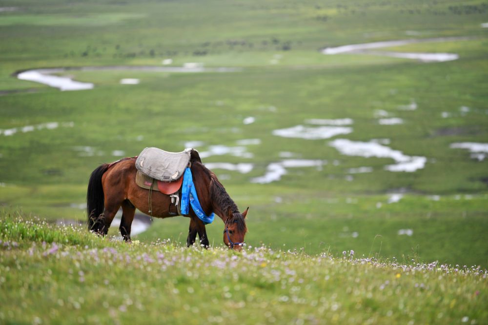 ↑一匹马在玛曲县阿万仓湿地上吃草(7月6日摄)。