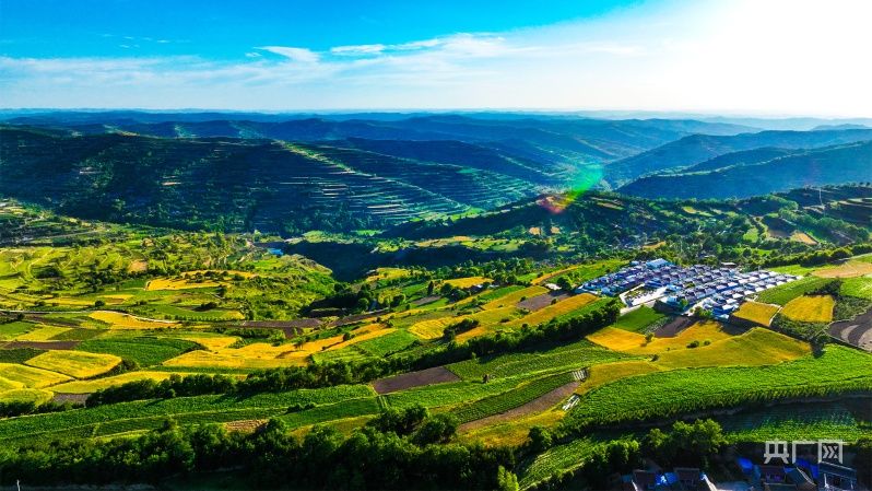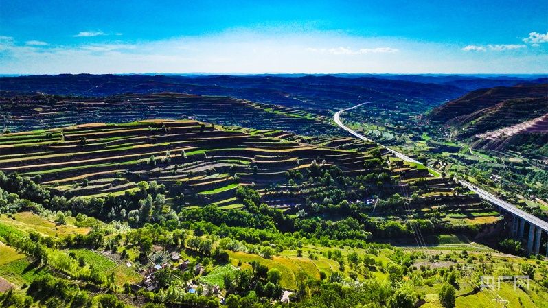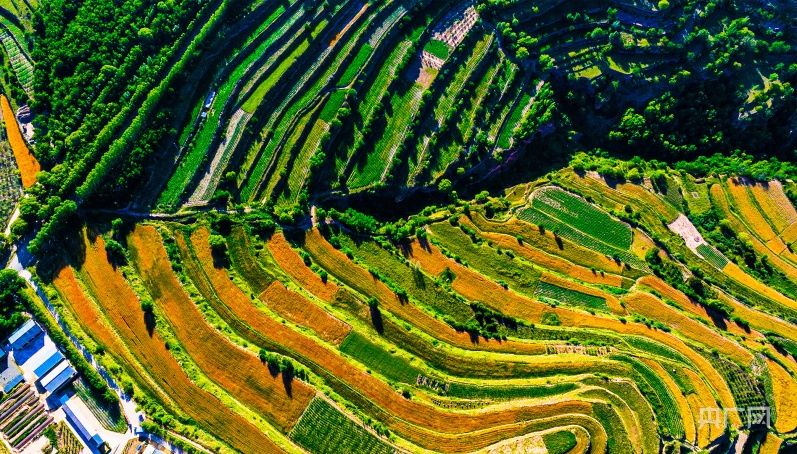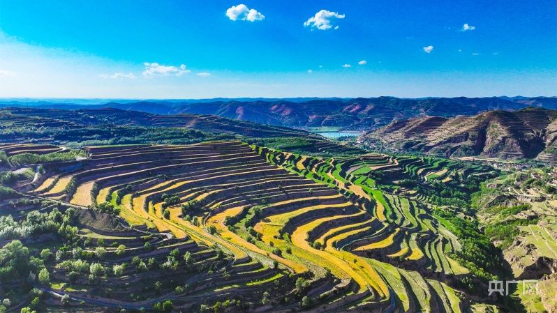 从田地到田埂,从梁峁到沟底,处处散发着盛夏的气息,斑斓色彩装满了整个梯田,遍布于黄土地上的万千沟壑。高空俯瞰,百万亩梯田,如同千万条绿色的彩带,环绕在山川之间。金黄的麦田,翠绿的果园,一幕幕美丽的图景令人目不暇接。