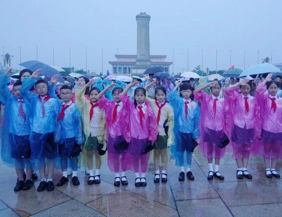 7月4日早晨,是孩子们去天安门广场看升国旗的时间,也是他们北京之行的最高光时刻。不巧的是,从半夜开始,北京下起了淅淅沥沥的雨。但这丝毫没有打扰孩子们的兴致。他们穿着雨披,在天安门广场上整齐列队,等待着那一神圣时刻的到来。4点51分,在国旗即将升起的时候,雨势忽然加大。但孩子们全都自觉地脱下了雨帽,把红领巾从雨衣里小心翼翼地拿出,在胸前抚平。国歌响起,他们齐刷刷地举起了右手,向着冉冉升起的五星红旗,敬了一个庄严的队礼。