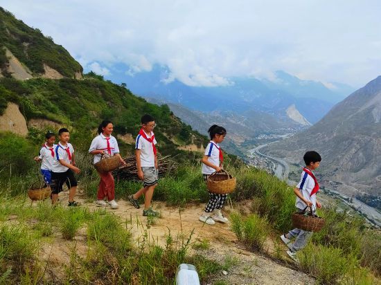 文县东坝童声合唱团的孩子们在文县山上采摘花椒。