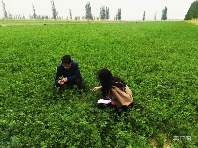 技术员查看紫花苜蓿长势(央广网发 高翠霞 摄)