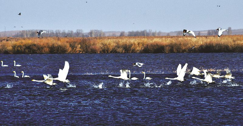 成群的白天鹅在民勤县红崖山水库嬉戏 李军摄