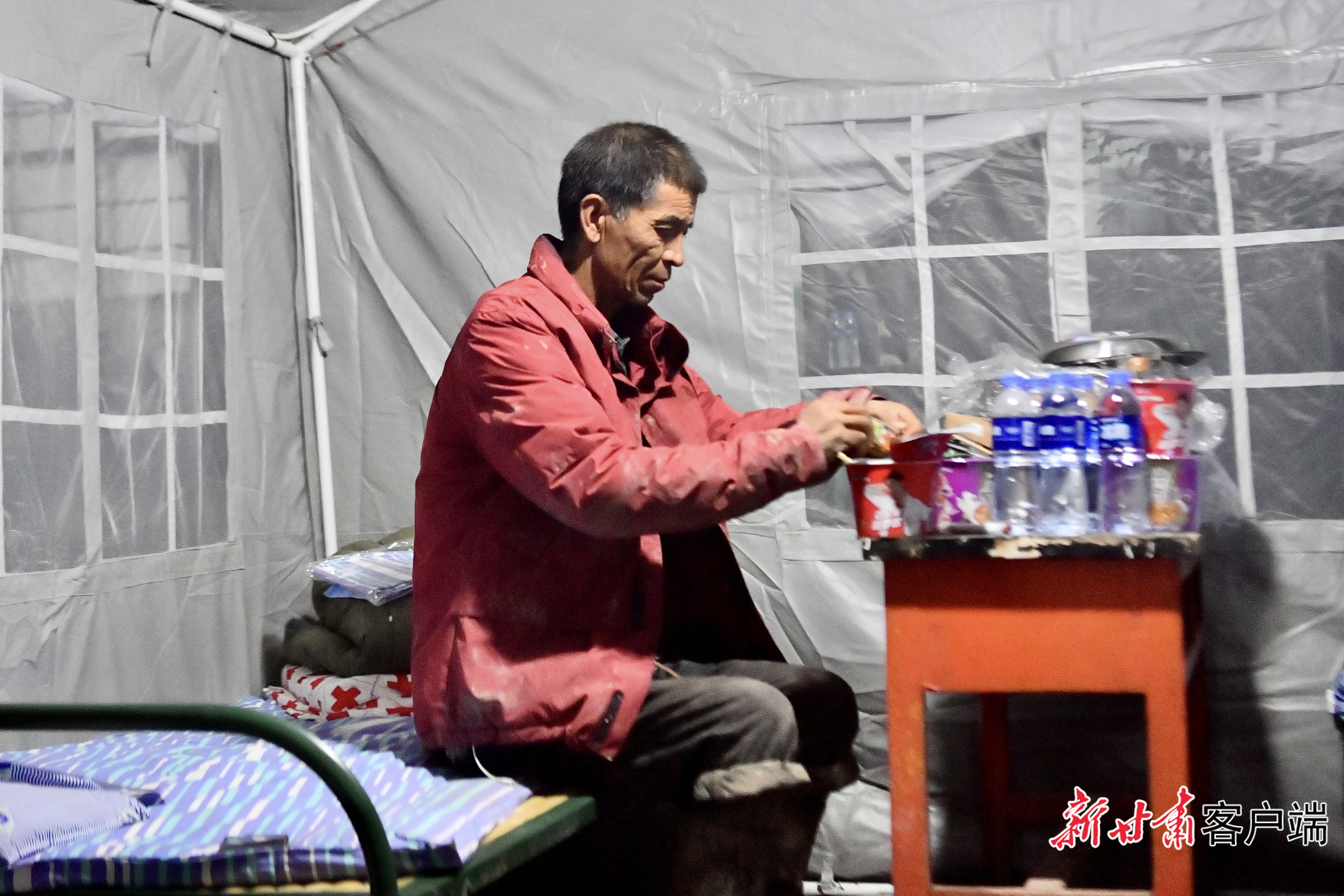在完代居住的帐篷对面,忙碌了一天的银巴顾不上换下沾满泥泞的雨鞋,匆忙撕开一盒方便面冲泡了起来。“我也是章子沟村受灾村民,进入安置点后,这悬着的心也就放下来了。”方便面泡上之后,银巴在等待的时间里拨打了好几个电话,再次给外地的亲戚报了平安。